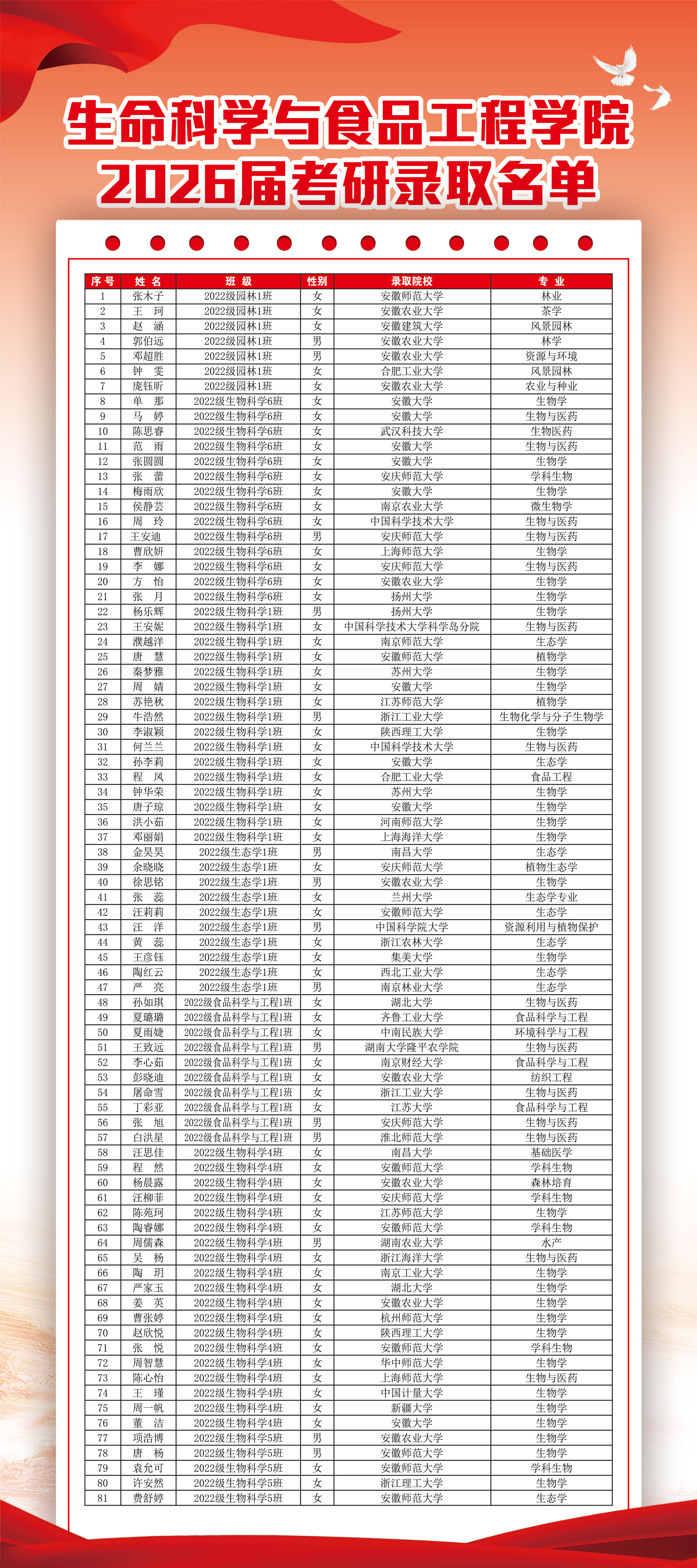 近日,2026年全国硕士研究生招生录取工作顺利落幕,生命科学与食品工程学院再传捷报。2026届...