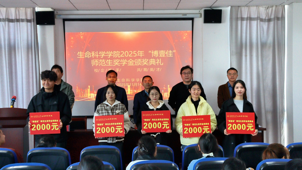 11月14日,生命科学学院在G202举行“博壹佳”师范生奖学金颁奖典礼,旨在表彰综合素质突出的优秀师范学子,激励全院师范生勤奋学习,拼搏进取,进一步培养具有高尚师德、扎实专业素养和创新精神的未来教育工作者。学院党委书记朱昌流、党委副书记张万茂、副院长李从虎、博壹佳教育培训中心校长刘国柱、全体获奖学生参加典礼。典礼由张万茂主持。