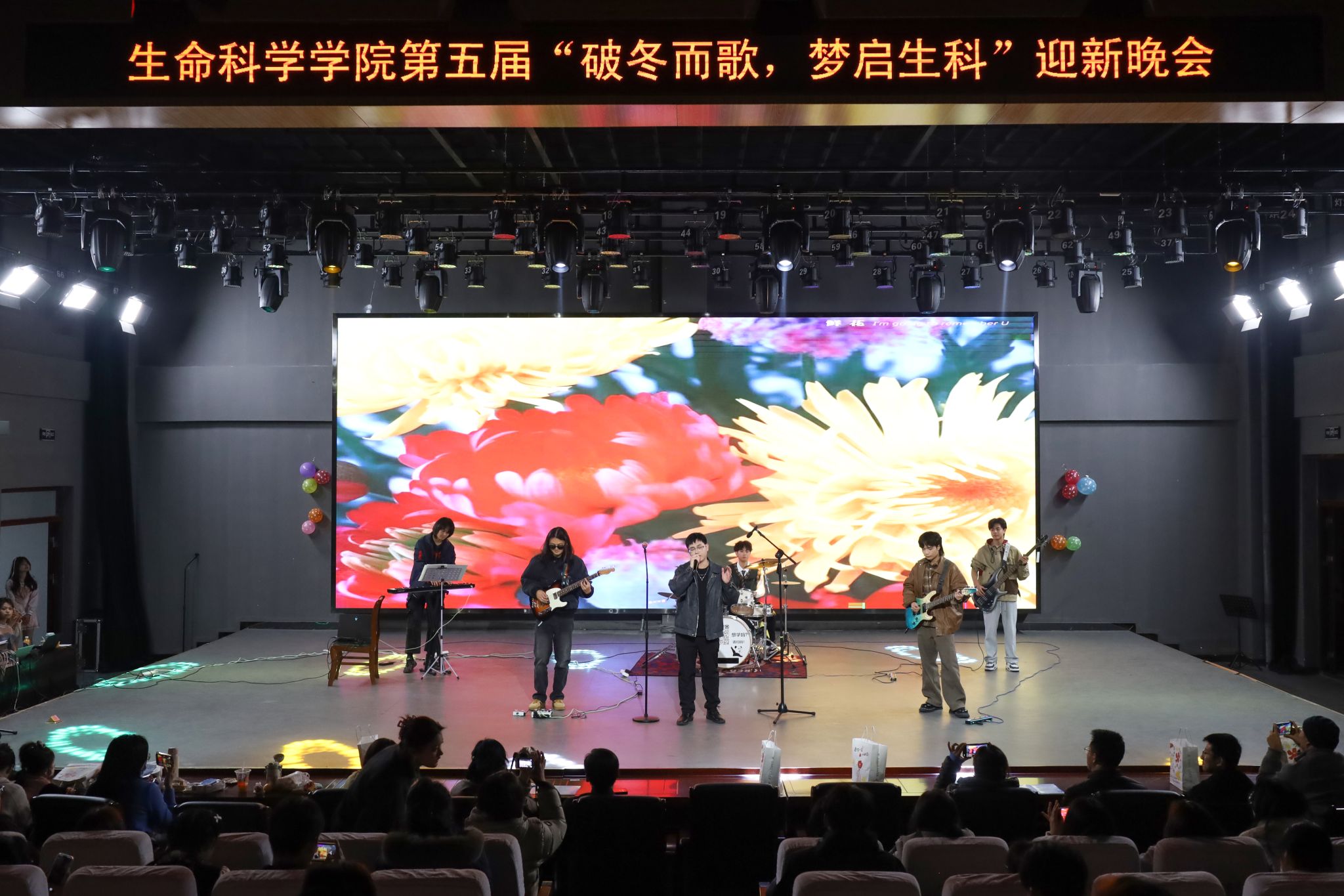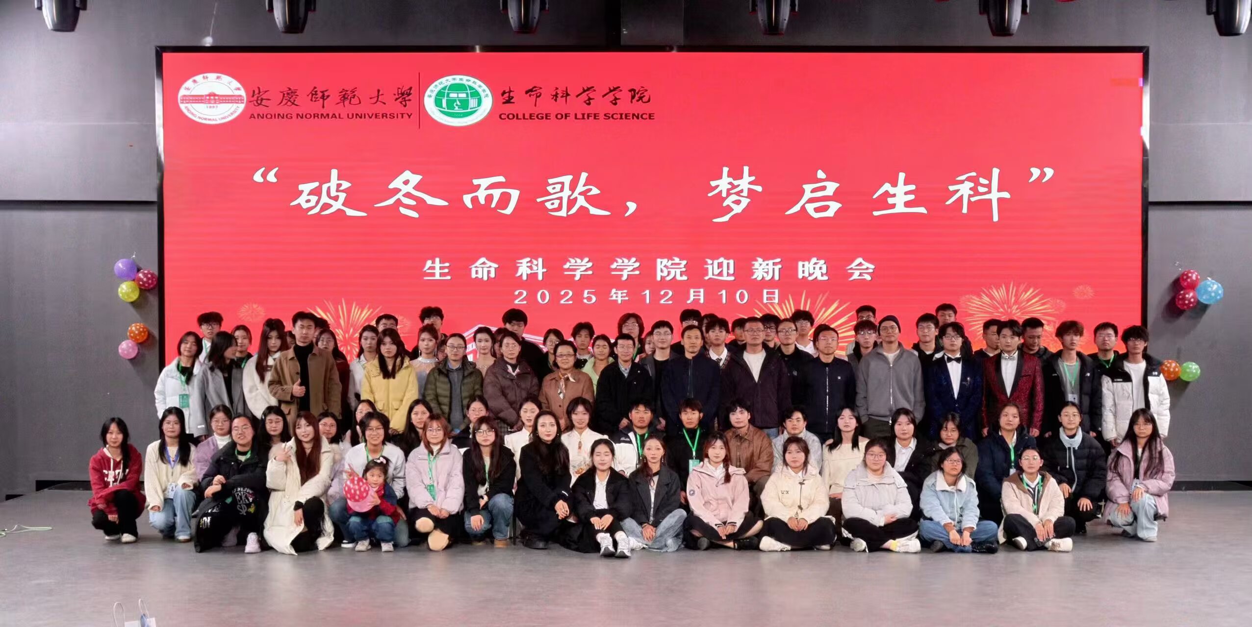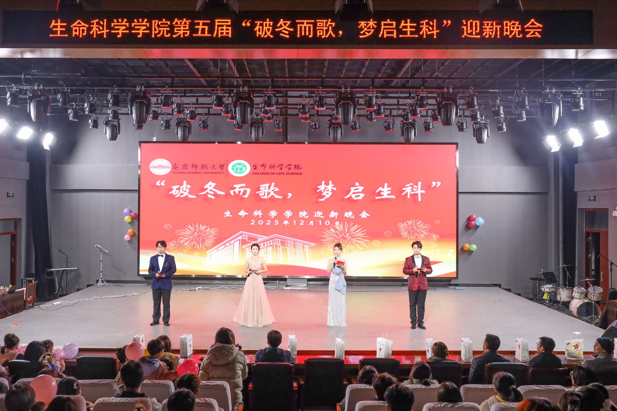 “演出道具排放好。”“这个片段再来一遍。”……12月10日,生命科学学院第五届“破冬而歌,梦启生科”迎新晚会在传媒学院演播厅如期举行。学院党委副书记张万茂、副院长穆丹及数位教师代表与300余名学生欢聚一堂,共赏这场青春洋溢的演出。