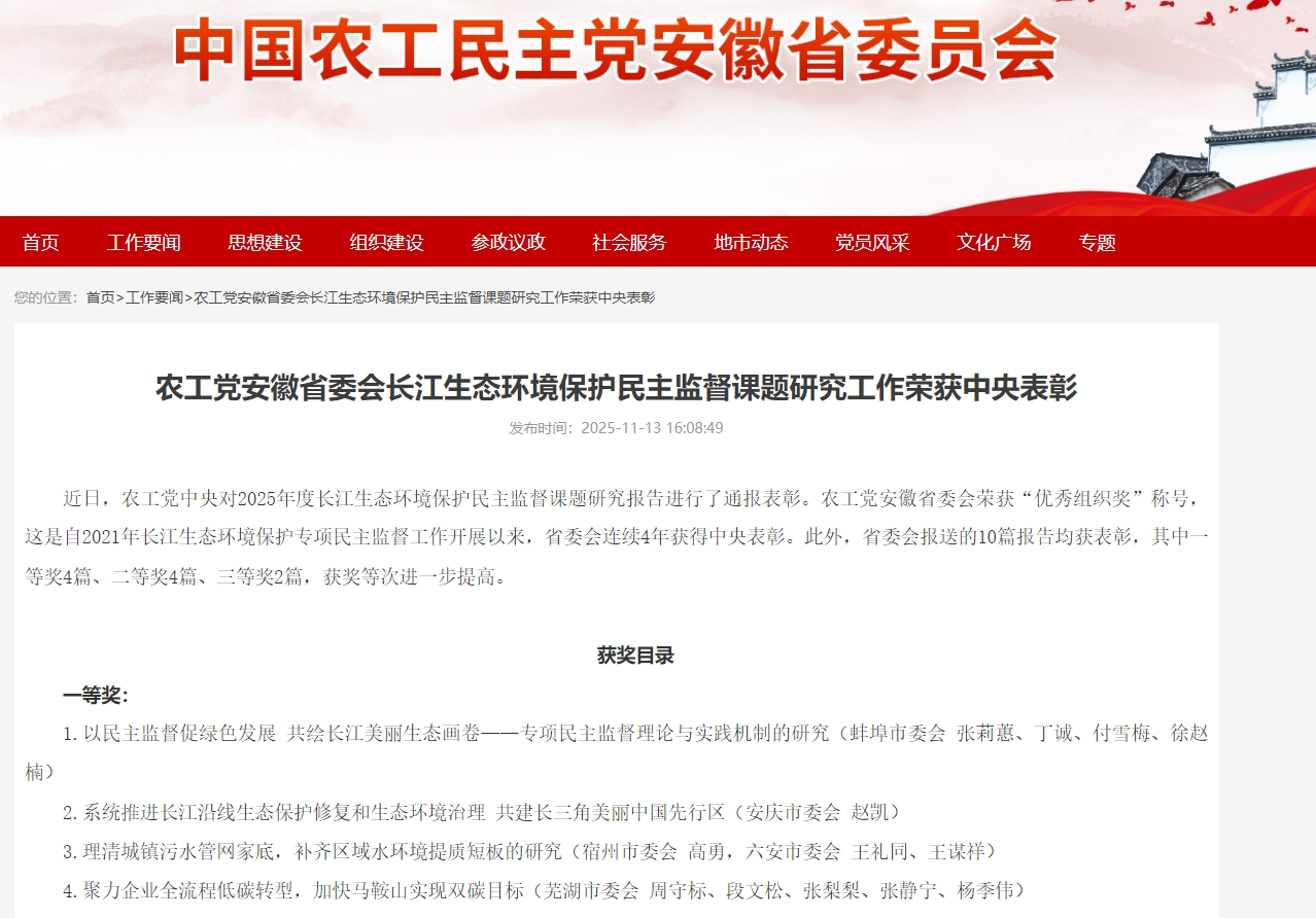 近日,农工民主党中央对2025年度长江生态环境保护民主监督课题研究报告进行了通报表彰。由我校生命科学学院赵凯教授领衔的民主监督课题“系统推进长江沿线生态保护修复和生态环境治理 共建长三角美丽中国先行区”荣获一等奖。